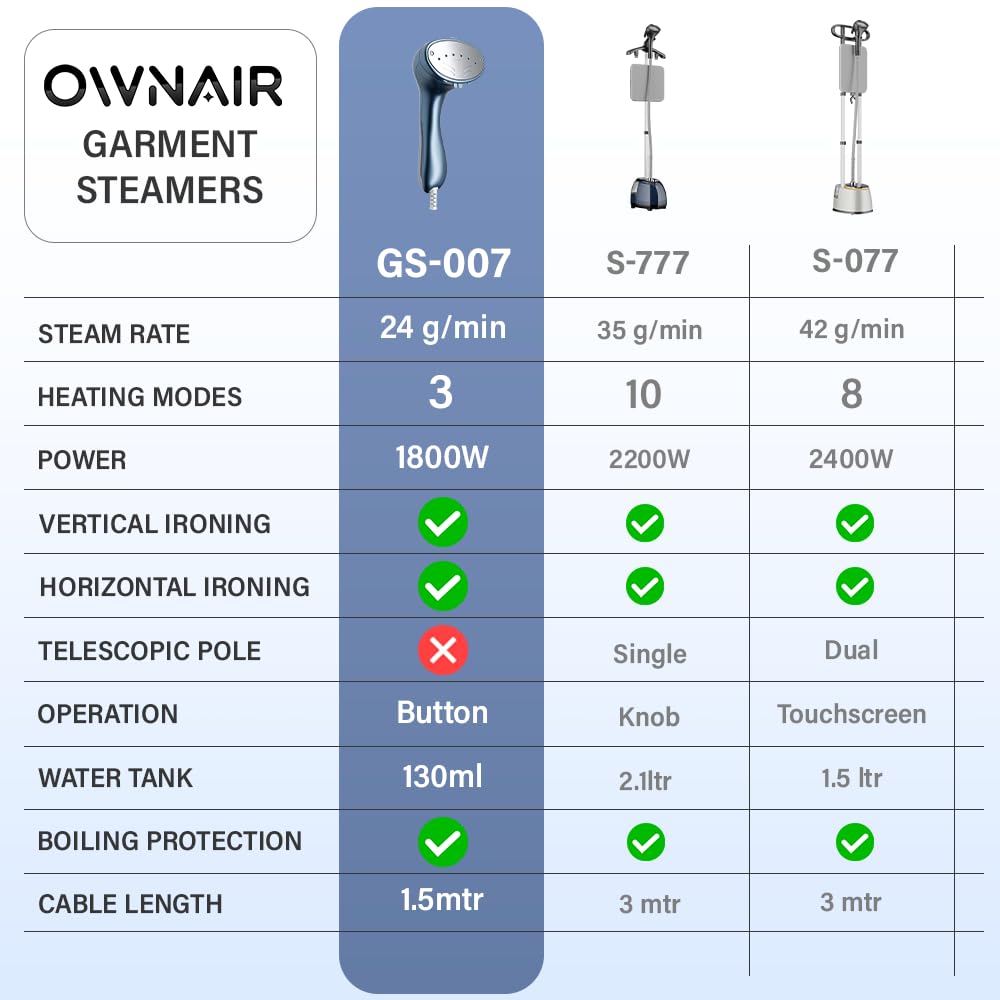 - Effortless Garment Refresh: Embrace the Ownair handheld garment steamer for clothes GS:007 for a seamless way to revitalize your clothing and this luxury steam press is perfect for daily use. Instantly glow your clothes with this iron steamer for clothes.